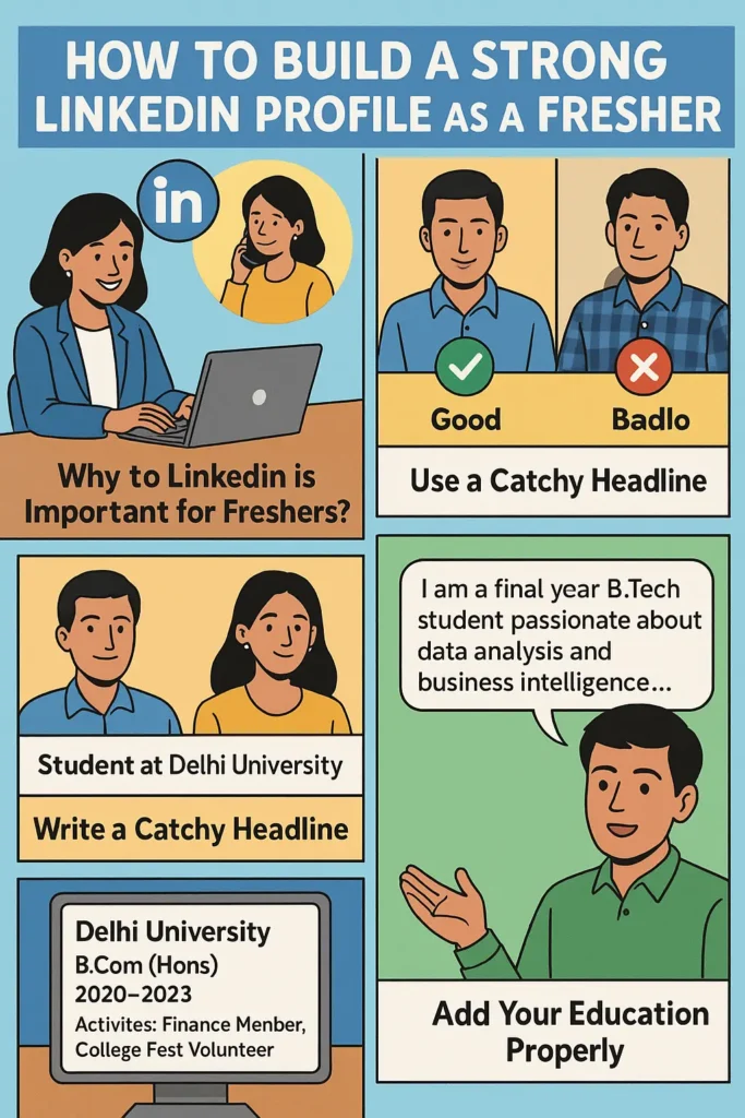 If you are a fresher looking for jobs, LinkedIn is your best friend. Many of us create a LinkedIn account just for the sake of it but never make it strong. Today, I will share simple and practical tips with examples to build a powerful LinkedIn profile even if you are just out of college.