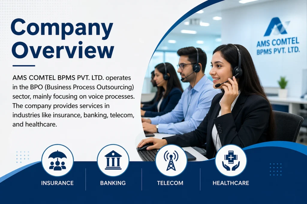 AMS COMTEL BPMS PVT. LTD. operates in the BPO (Business Process Outsourcing) sector, mainly focusing on voice processes. The company provides services in industries like insurance, banking, telecom, and healthcare.