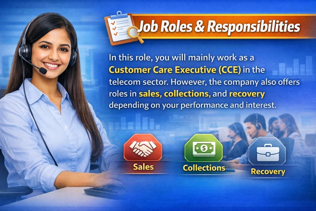 In this role, you will mainly work as a Customer Care Executive (CCE) in the telecom sector. However, the company also offers roles in sales, collections, and recovery depending on your performance and interest.